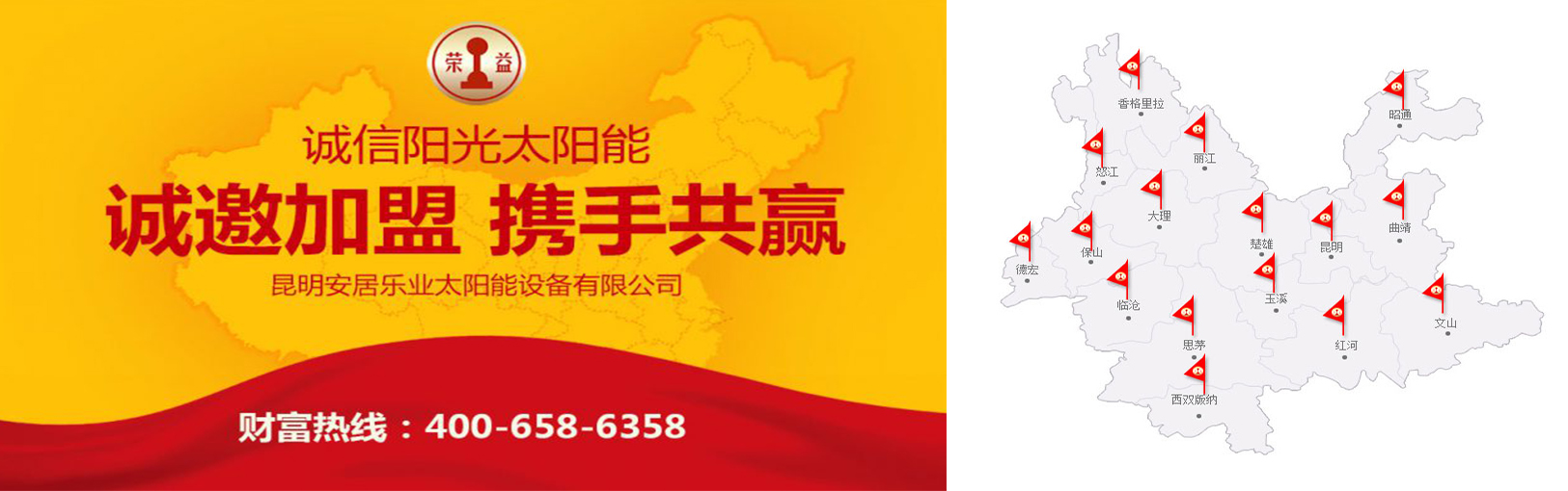 昆明安居樂業太陽能設備有限公司(原誠信陽光太陽能設備廠)是專業生產、研制、開發太陽能熱水器的企業,誠信陽光和榮益牌產品投產至今,經銷商遍布云南各 地,暢銷云南省內及出口到東南亞周邊國家,深受用戶好評,特別是在云南香格里拉和西雙版納地區,氣候和環境惡劣的地方均能普及,昆明鐵路局3000多公里 鐵路沿線均有公司產品,更能說明其質量。公司本著重質量、守合同、講信譽,視質量為生命,視信譽為衣食父母,想用戶所想,急用戶所急,以合理、公道的價格 接近用戶,以優質完善的售后服務贏得用戶。